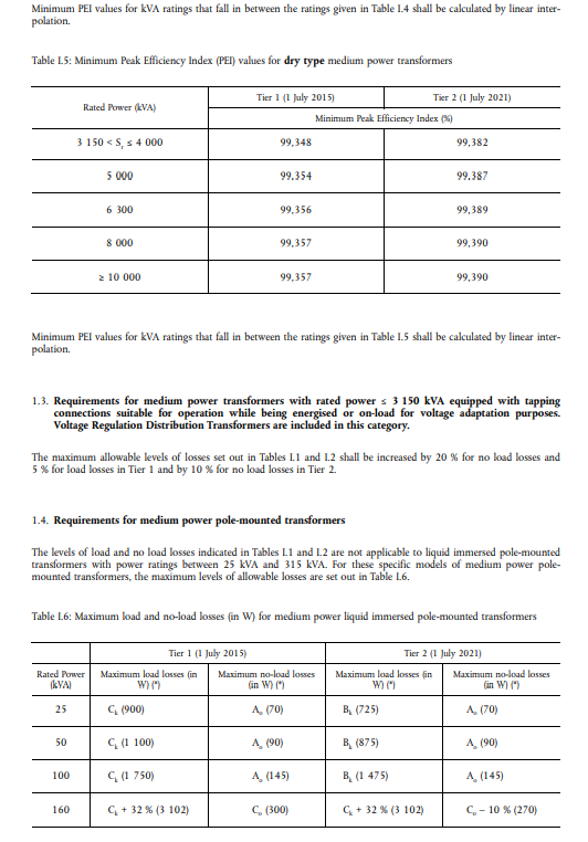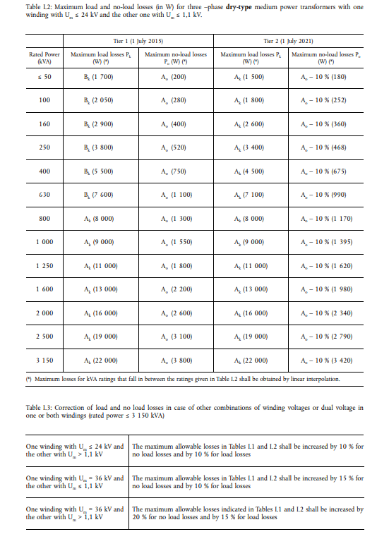 If we interpret Table 1.1; while the power classification on the far left remains the same, you will see that the values written in the Tier-1 section decrease in the Tier-2 section on the right. The Po maximum values of transformers with powers of 3150 kVA and below will decrease by 10%. When you compare the Po losses at maximum load, for example, for 2500 kVA, it will be 22000 W until 1 July 2021, while it will be 18500 W as of July 1.